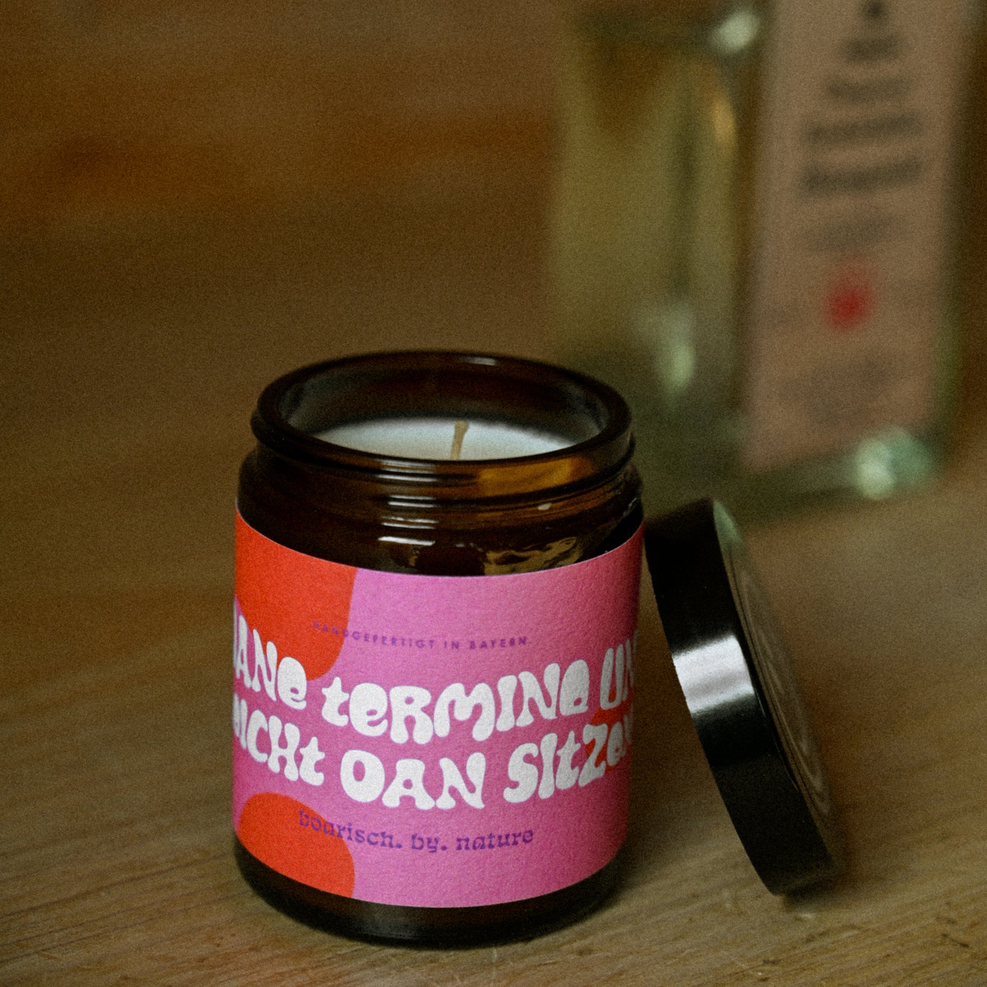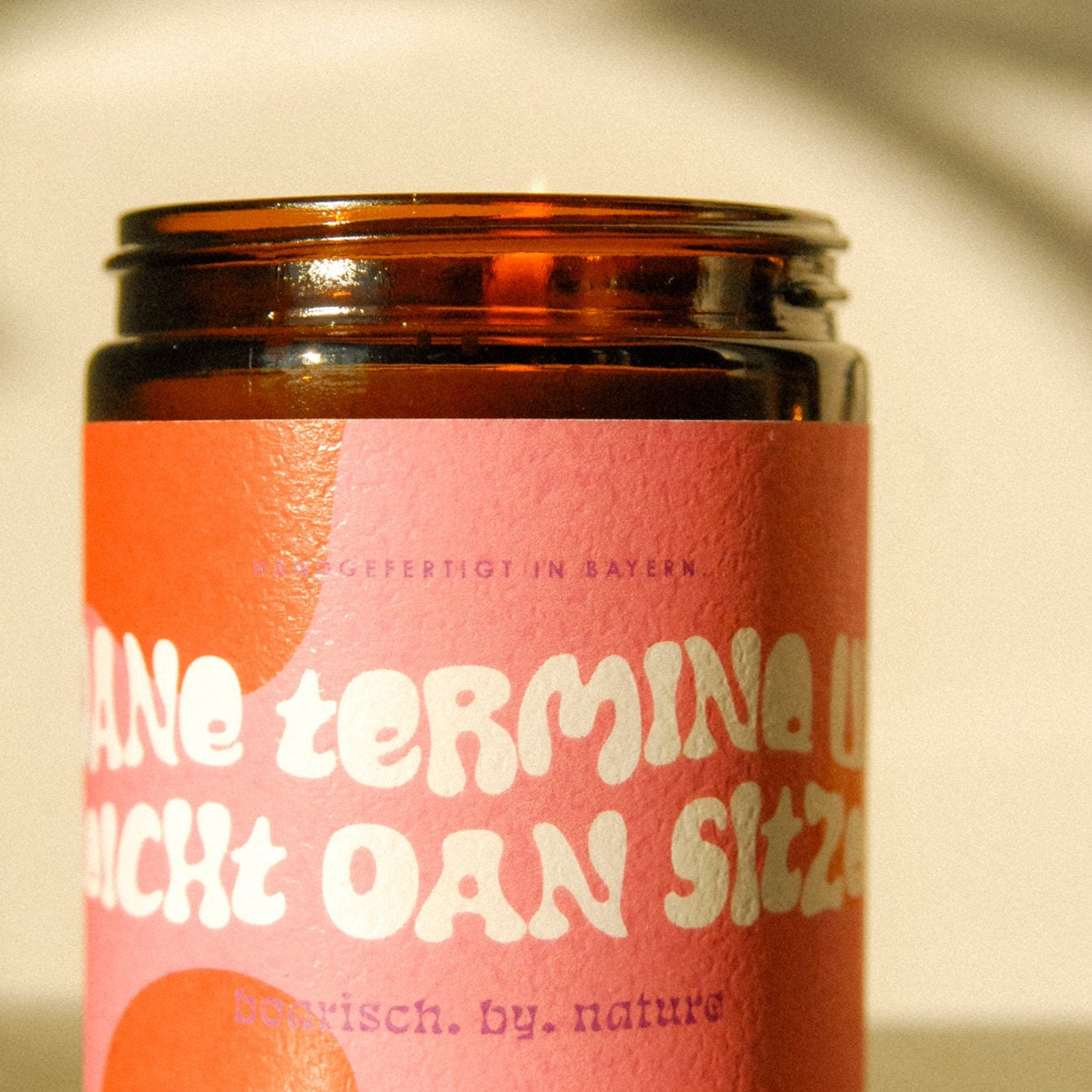 Koane Termine und leicht oan sitzen | Bayerische Spruchkerze 140g